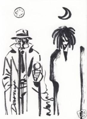 To benefit the Comic Book Legal Defense Fund, Neil Gaiman agreed to draw on several sketch cards. Those cards were then sent to various artists, who added their own contribution. Below you can see artwork by Gaiman and Jeffrey Brown, Darwyn Cooke, and Jill Thompson.