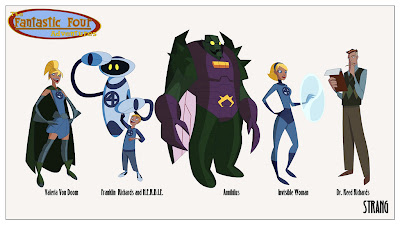 Cartoony versions of the Fantastic Four, Franklin, Doctor Doom, and Annihilus by Bob Strang. You can find desktop wallpaper sized images at these links. And don't miss his take on the Darkstalkers and sci-fi girl on a rocket sled.