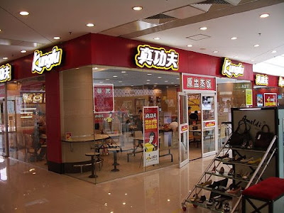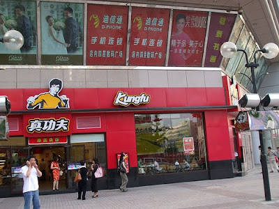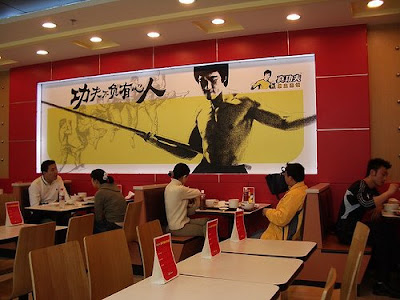 Kungfu is the name of a chain of fast food restaurants in China that feature Bruce Lee's likeness. Here's shots of a few Kungfu exteriors: