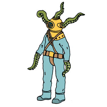 An octopus-infested diving suit by Andrew Rae. You can see several more odd characters and monsters by Andrew here.