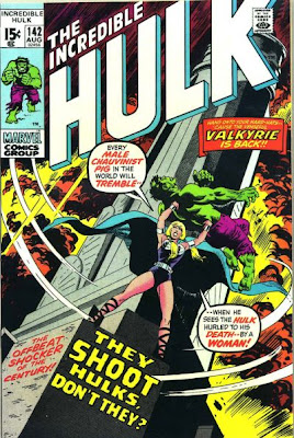 "Every male chauvinist pig in the world will tremble...when he sees the Hulk hurled to his death - - by a woman!" So says The Valkyrie in the cover to Hulk #142, which is adapted from a Tom Wolfe story called "