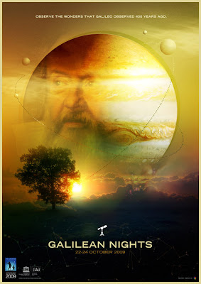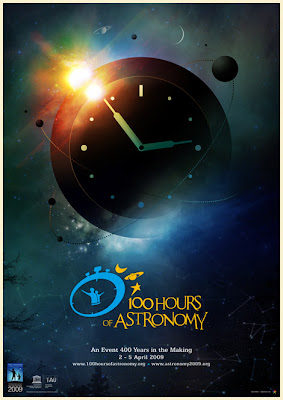 Galilean Nights and 100 Hour of Astronomy posters by James White. The first poster is for the International Year of Astronomy to promote October's 400th anniversary of Galileo Galilei looking to the cosmos through his telescope. The second poster was for April's 100 Hours of Astronomy. James' webstore is here.