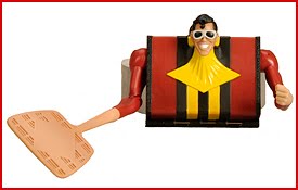 DCU Plastic Man has interchangeable standard arms, stretchy arms, giant form hands (a fly swatter and a bouncy ball with racket), and interchangeable stretchy neck and leg springs.Plus, DC Universe Plastic Man Suitcase (free with purchase):
