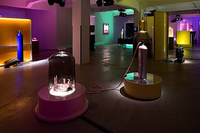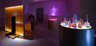 The Kandors project is an exercise in the translation of graphic two-dimensional images into three dimensional sculptures. The flat areas of background color in the comic book panels have been rendered as illuminated Plexiglas walls. The various versions of Kandor are represented by under-lit resin sculptures in a variety of colors. The various bases and plinths that the Kandors sit upon have been constructed as actual furniture. But, in many cases, the bottles, bases, and cities have been separated and spaced apart, complicating their formal relationships. Kelley has described this process as an attempt to make an artwork as flat, colorful, and visually simple as a painting by Matisse which operates in three dimensions, yet still maintains an overall sense of graphic flatness. All of the works feature light or motion, and the exhibition is self-illuminated.