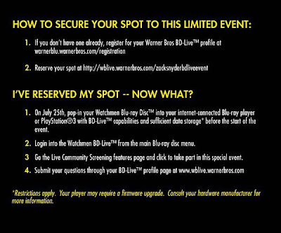 July 25th at 9:30 PM is the Watchmen Director's Cut Screening with Zack Snyder, which you can participate in if you have a Watchmen Director's Cut on Blu-ray Disc, Blu-ray Player that supports BD-Live, and Blu-ray Player connected to the Internet. If you have all that, then